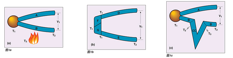了解連續(xù)熱電偶定律很重要。在圖1d的 上部分顯示的兩個(gè)元件中,一個(gè)熱電偶 的熱端溫度為T(mén)1,開(kāi)口端溫度為T(mén)2。第 二個(gè)熱電偶的熱端溫度為T(mén)2,開(kāi)口端溫 度為T(mén)3。測(cè)量T1的熱電偶的電動(dòng)勢(shì)emf 大小為VF1;另一個(gè)熱電偶的電動(dòng)勢(shì)大小 為V2。兩個(gè)電動(dòng)勢(shì)emf之和,即V1+V2等 于電動(dòng)勢(shì)V3,V3是熱電偶在溫度T1與T3 之間工作總共產(chǎn)生的電動(dòng)勢(shì)。根據(jù)此定 律,為一個(gè)開(kāi)口端參考溫度指定的熱電 偶可用于不同的開(kāi)口端溫度。