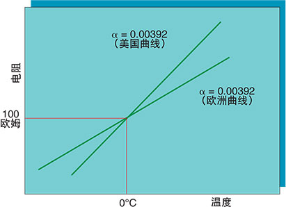 利用該斜率繪制的電阻與溫度曲線(xiàn)即為 所謂的歐洲曲線(xiàn),其原因是這種成份的 RTD首先在歐洲大陸廣泛使用。使圖復(fù) 雜化的是還有另一種標(biāo)準(zhǔn)斜率,它與另 一種差別不大的鉑成份有關(guān)。這種斜率 的α值略高,為0.00392,它遵循所謂美 國(guó)曲線(xiàn)。