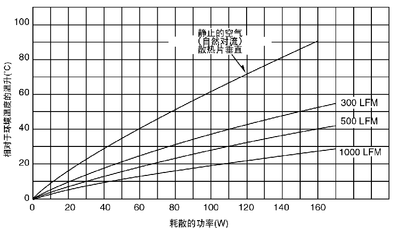 并非所有散熱片制造商都用°C/W來 表示散熱片的特性。有些制造商用相 對(duì)于環(huán)境溫度的溫升值表示,如圖23 所示。在這種情況下,通過用功率耗 散(W)除以溫升(°C)來得到RΘSA的 值。例如:取功率耗散刻度軸上60W 的點(diǎn),自由空氣曲線將指示40度的溫 升。因此: