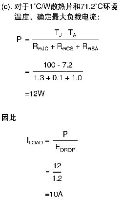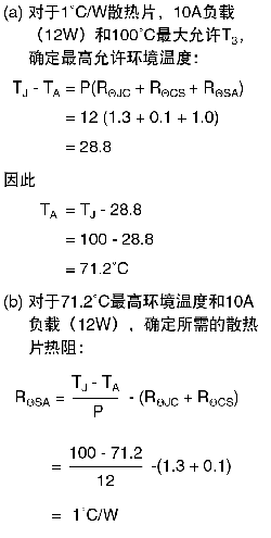 假設(shè)從結(jié)點(diǎn)到外殼的熱阻(RΘJC)為 1.3°C/W,將上面的典型值代入公 式,可以找出未知參數(shù)的解法,如最 大負(fù)載電流、最高工作溫度,以及合 適的散熱片熱阻。當(dāng)已知這些參數(shù)中 的兩個(gè)時(shí),可以解出第三個(gè),如下面 的示例中所示: