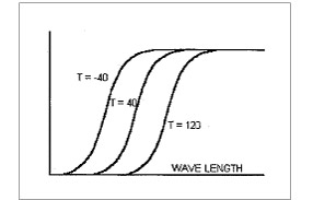 圖1。光纖溫度傳感器的工作原理是基于砷化鎵晶體半導(dǎo)體的吸收/投射特性。隨著晶體溫度的升高,會使其透射光譜躍變到更大波長,即以特定波長從初始的0%躍遷到100%。此處所示三個溫度以oC計(jì)量。