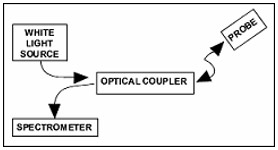 圖3。白光源將光注入耦合器的其中一個分支。這些光沿著探頭的光纖傳播到砷化鎵中,由砷化鎵吸收其中的一部分。未被吸收的光則由介質(zhì)鏡反射,使其沿探頭返回到耦合器,并在耦合器中被導(dǎo)向至光譜儀。